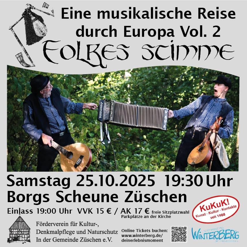 Zwei talentierte Musiker, eine gemeinsame Leidenschaft zur Volks- und Folkmusik - das ist „Folkes Stimme“. Bjarne Krämer und Johannes-Georg Kappen laden ihr Publikum auf eine spannende musikalische Reise durch nahezu alle Länder Europas ein. Am Samstag, den 25. Oktober 2025 präsentieren sie ihr neues Programm in Borgs Scheune.